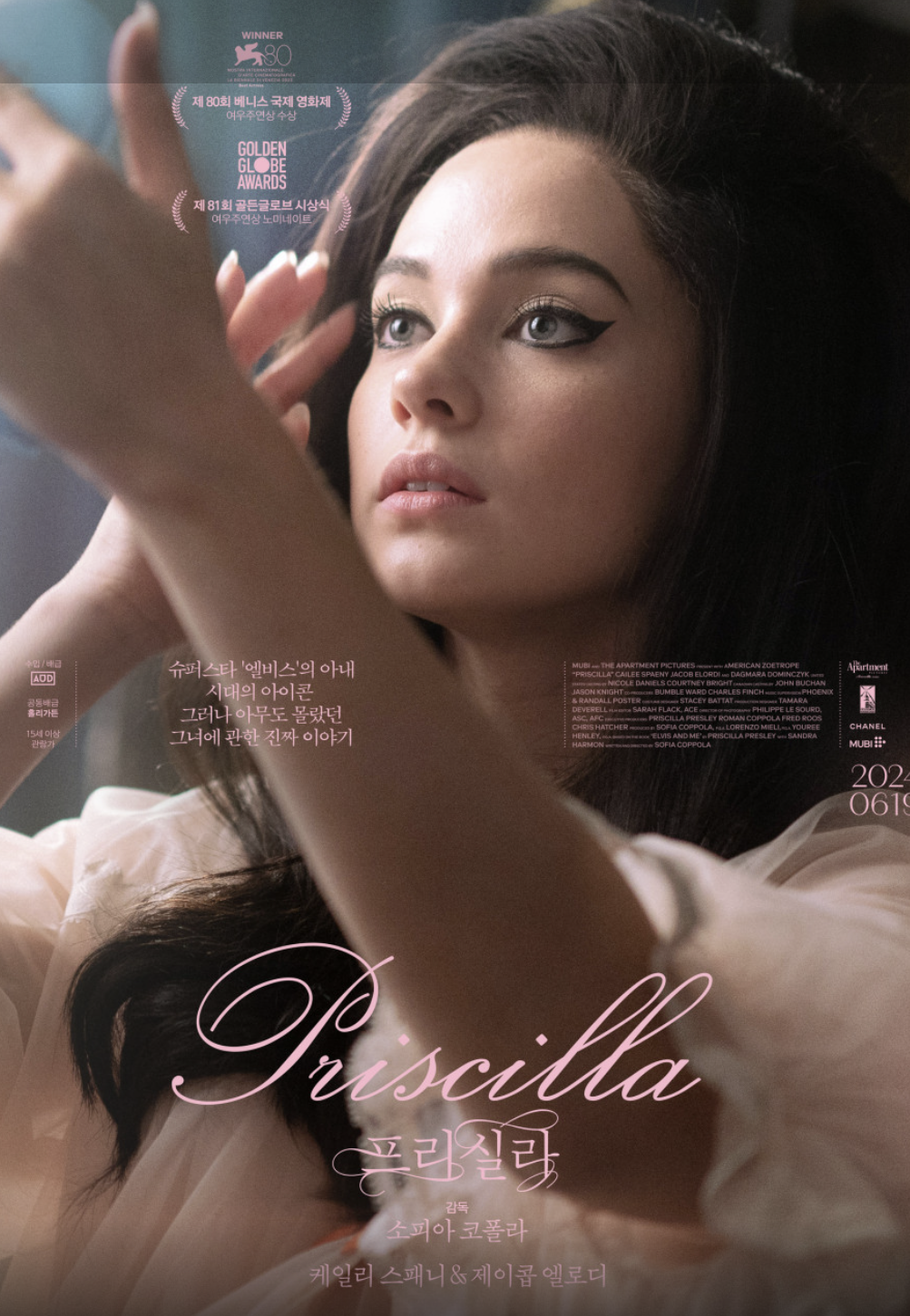소피아 코폴라 감독은 《로스트 인 트랜스레이션》과 《마리 앙투아네트》 등에서 인간의 내면적 고립과 젊은 여성의 정체성 탐색을 꾸준히 다뤄왔다. 《Priscilla》에서도 그녀의 특유의 섬세한 연출이 돋보인다. 영화는 화려한 조명 대신 부드럽고 절제된 톤으로, 프리실라가 느끼는 감정의 섬세한 변화를 담는다. 특히 프리실라 역의 케일리 스패니(Cailee Spaeny)는 어린 시절의 순수함부터 아내로서의 불안, 그리고 독립을 결심하는 내면의 강인함까지 폭넓게 소화하며, 이 영화로 베니스 영화제 여우주연상을 수상했다. 엘비스 역의 제이콥 엘로디(Jacob Elordi)는 단순한 아이콘이 아닌, 불안정하고 이기적인 인간으로서의 엘비스를 표현해 극의 균형을 맞춘다. 영화는 엘비스의 화려한 공연 장면보다는, 문 닫힌 방 안에서의 대화와 침묵으로 감정의 무게를 전달한다. 이는 ‘프리실라의 시선’이라는 점을 강조하는 코폴라의 연출 의도이기도 하다.